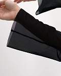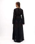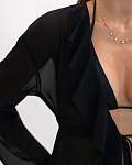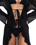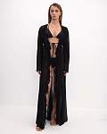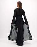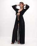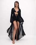Женская чёрная пляжная туника — идеальный выбор для тех, кто хочет выглядеть стильно и чувствовать себя комфортно на пляже. Её длина доходит до пола, а длинные рукава и рюши по всей длине планки придают ей изысканность и элегантность. Туника также украшена воланами и завязками спереди, что добавляет изюминку в образ.