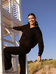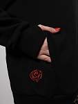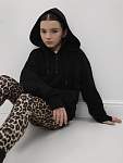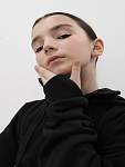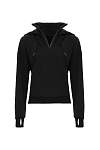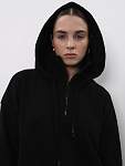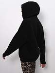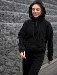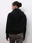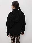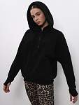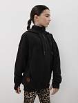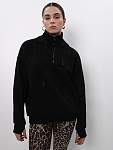 Чёрная женская спортивная свободная толстовка с высоким горлом и молнией — идеальный вариант для защиты шеи от холода во время занятий фитнесом. Свободный капюшон с хлопковыми шнурками позволяет удобно разместить причёску любого объёма, а манжеты из качественного кашкорсе с отверстиями для пальцев предотвращают задирание рукавов.