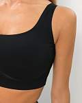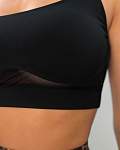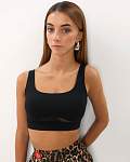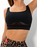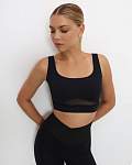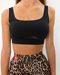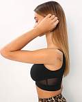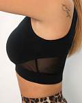 Женский спортивный топ от бренда PRB Sport. Черный топик на широких бретелях превосходно сидит по фигуре благодаря высококачественному эластичному спортивному фирменному трикотажу. Оригинальным элементом дизайна является декоративные вставки из сеточки. Вшитые бесшовные чашечки на сетчатом подкладе моделируют элегантные очертания груди, а широкая комфортная резинка под грудью обеспечивает эффективную поддержку груди даже при самых активных тренировках.