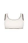 Широкие бретели обеспечивают надежную фиксацию топа на теле, не требуя дополнительной регулировки. Контрастная окантовка по краям изделия придает модели стильный акцент и подчеркивает спортивный характер.