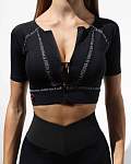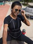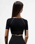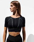 Рашгард имеет короткие рукава и широкую резинку под грудью, а также встроенные чашечки на сетчатой подкладке. Всё это создаёт эффективную поддержку груди и позволяет тренироваться в различных спортивных направлениях с максимальным комфортом.