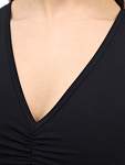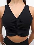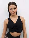 Топ имеет широкие бретели, V-образный вырез на груди и декоративную сборку спереди, что придаёт ему стильный вид. Отсутствие вшитых чашечек делает его универсальным и удобным для разных типов фигуры.
